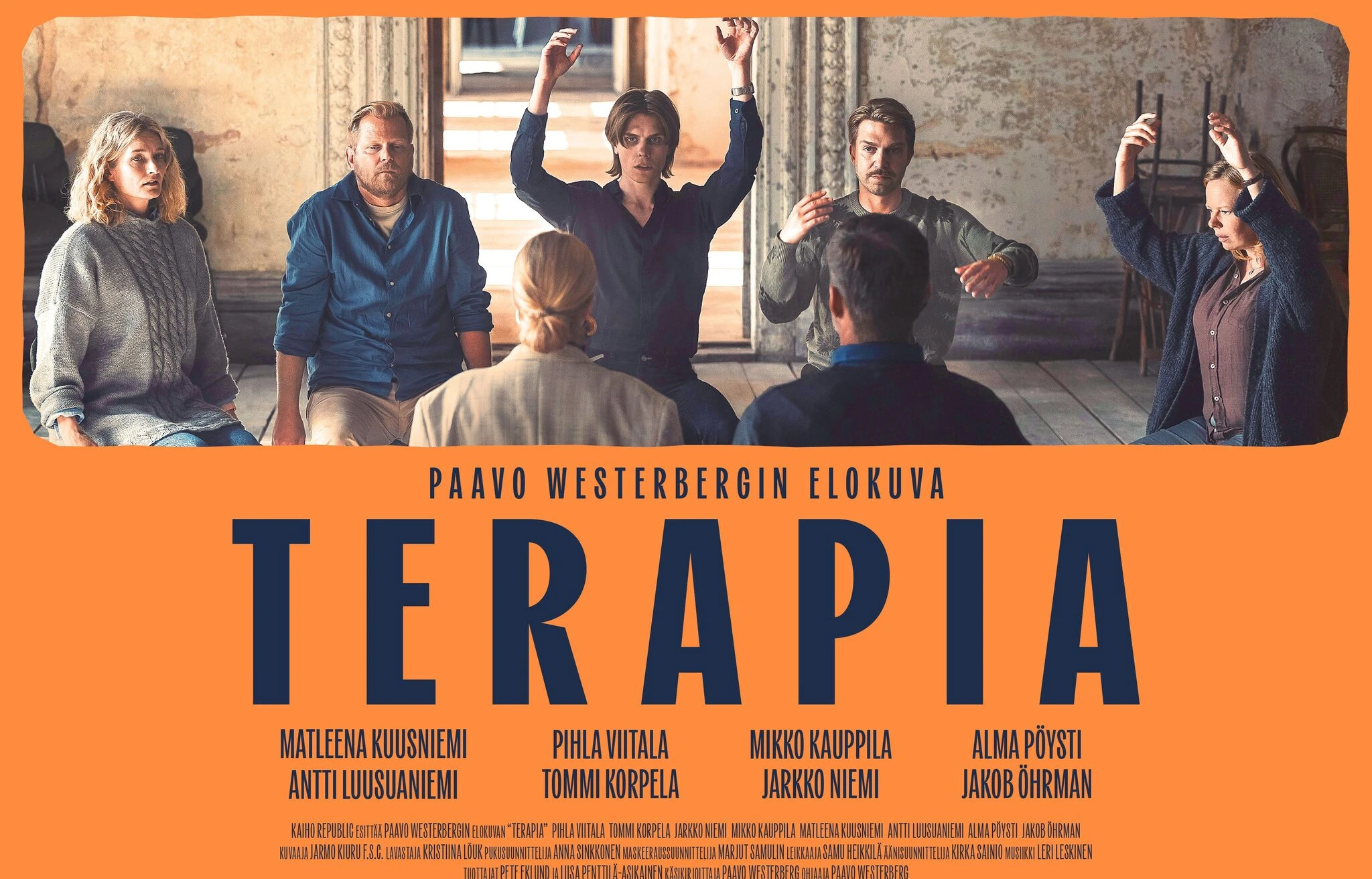 I filmen Terapia beger sig tre par till ett parterapiläger där ingenting går enligt planerna. På lägret hamnar de på kollisionskurs med sig själva och sina relationer. Samtidigt kämpar terapeuterna med sitt eget äktenskap och sina sönderfallande drömmar. Dramakedin är regisserad och manusförfattad av Paavo Westerberg. I filmen medverkar några av landets främsta stjärnor: Pihla Viitala, Tommi Korpela, Alma Pöysti, Matleena Kuusniemi, Antti Luusuaniemi, Jarkko Niemi, Mikko Kauppila och Jakob Öhrman.